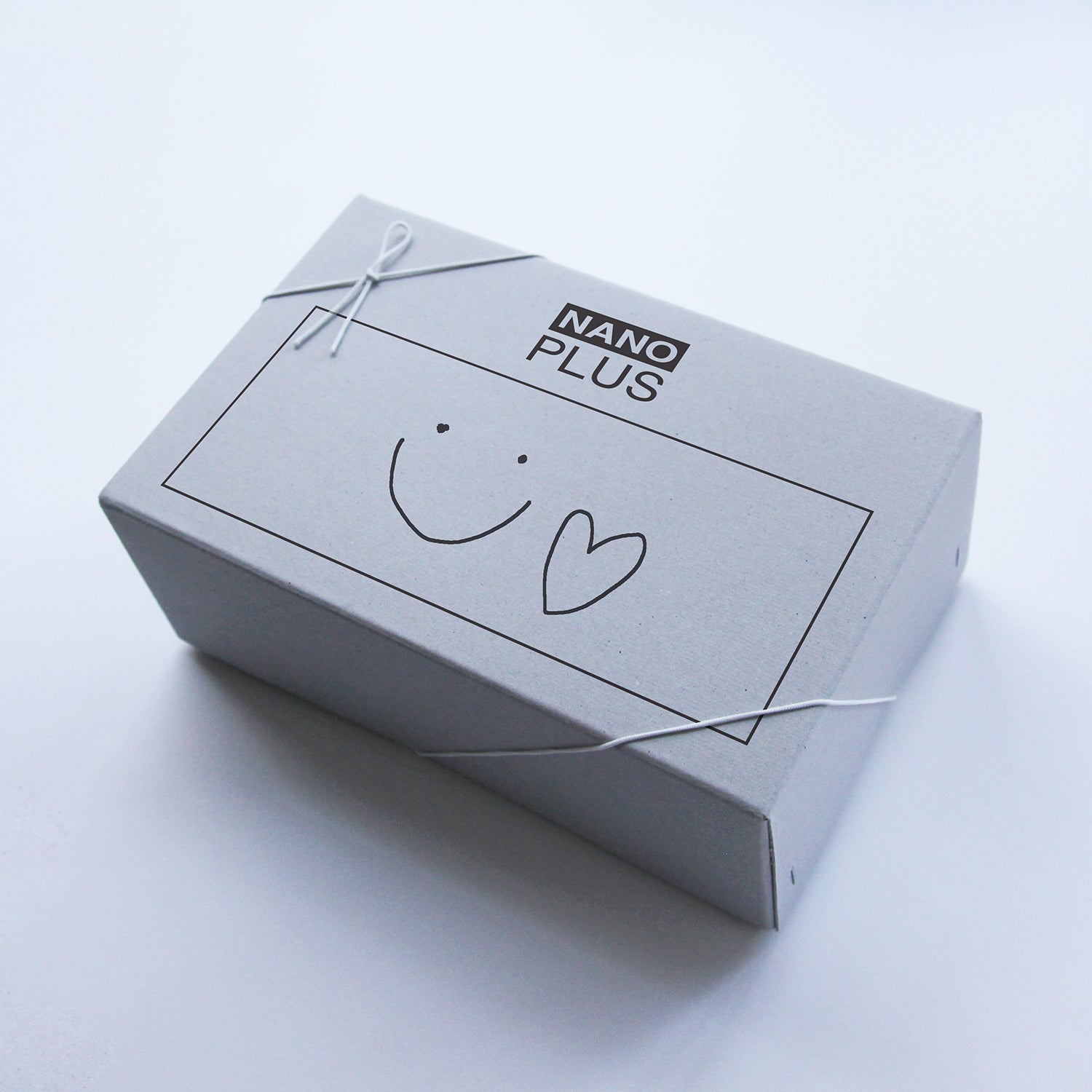 グレーのボード紙に、黒色でシルクスクリーンプリント印刷した、NANOPLUSのオリジナルギフトボックスです。