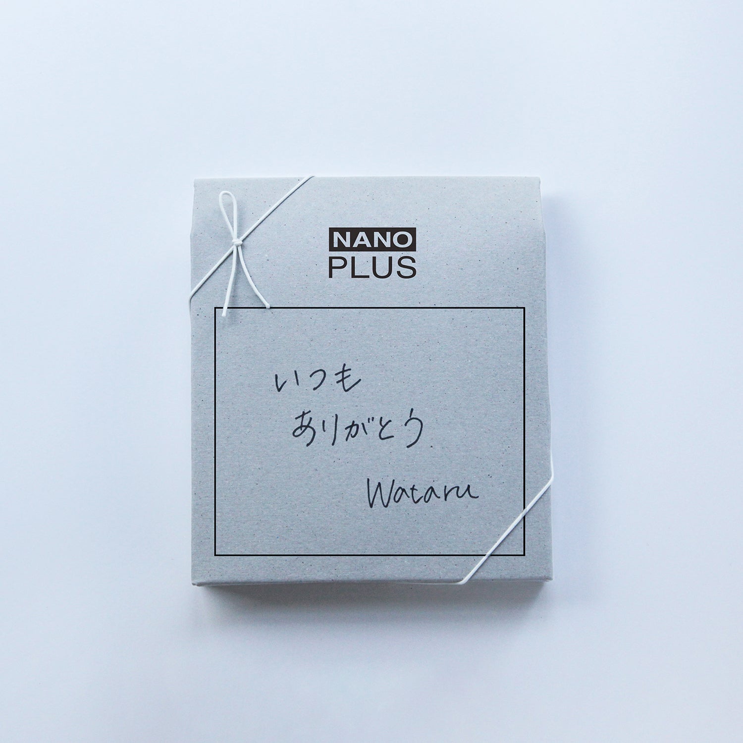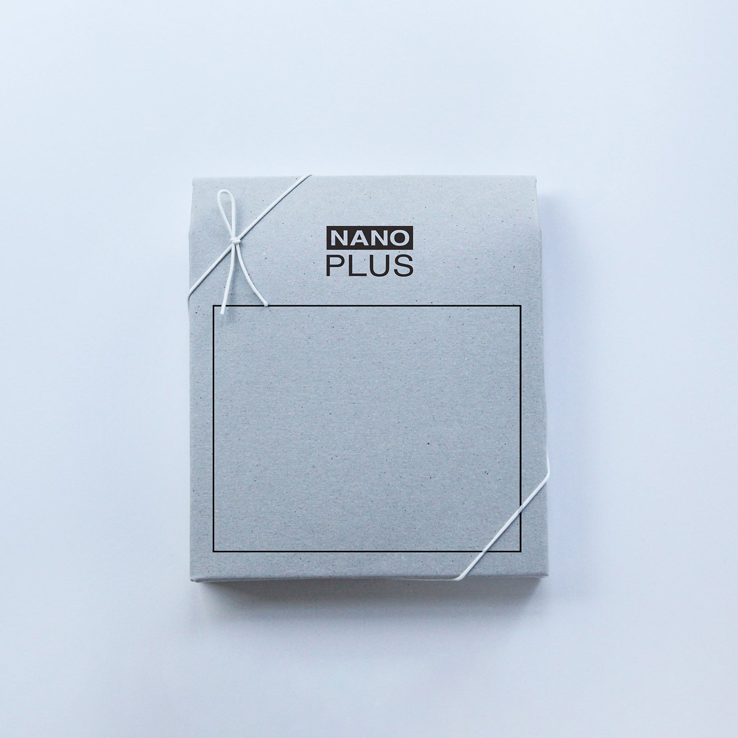 グレーのボード紙に、黒色でシルクスクリーンプリント印刷した、NANOPLUSのオリジナルギフトボックスです。